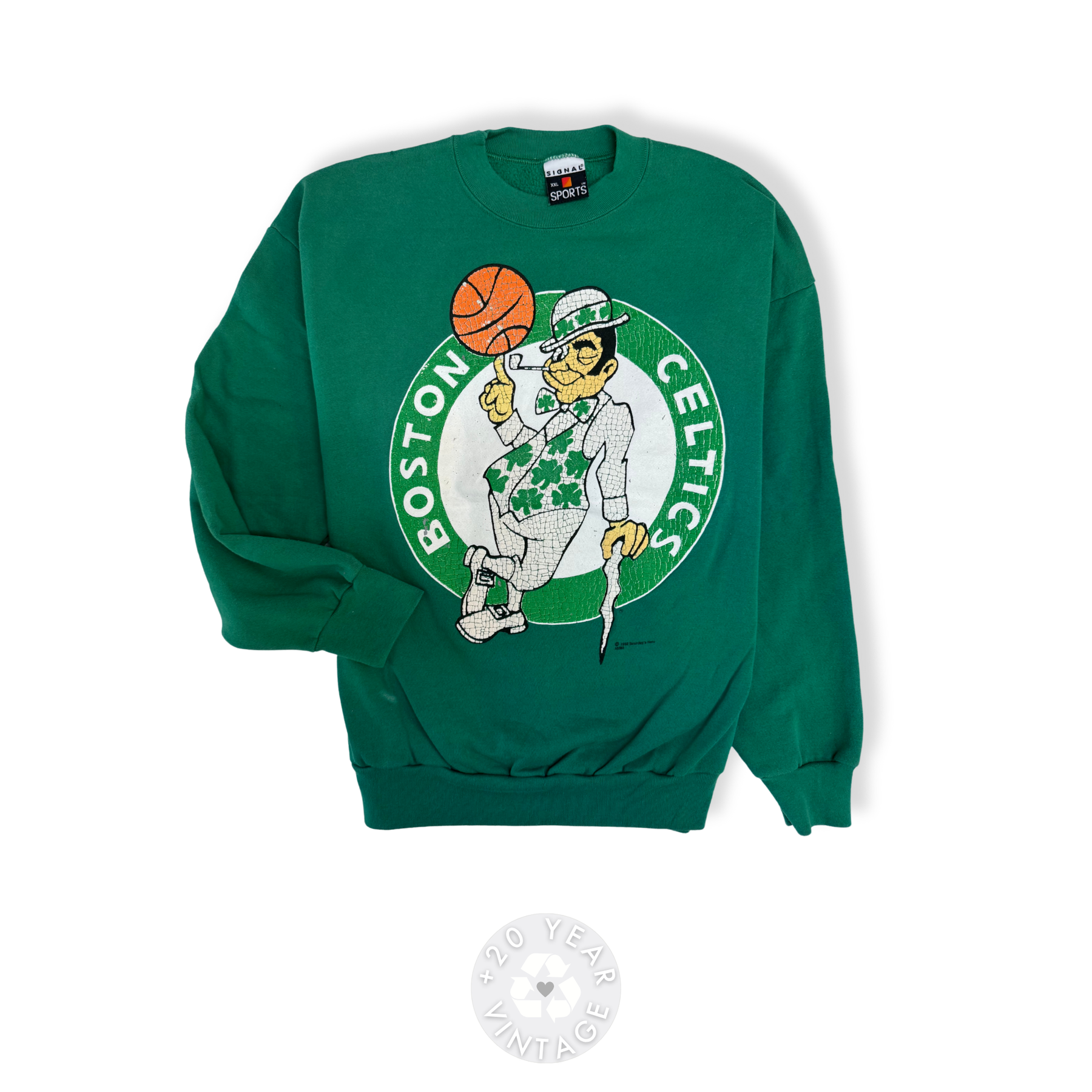 Vintage Boston Celtics crewneck sweatshirt with classic leprechaun spinning basketball logo.
