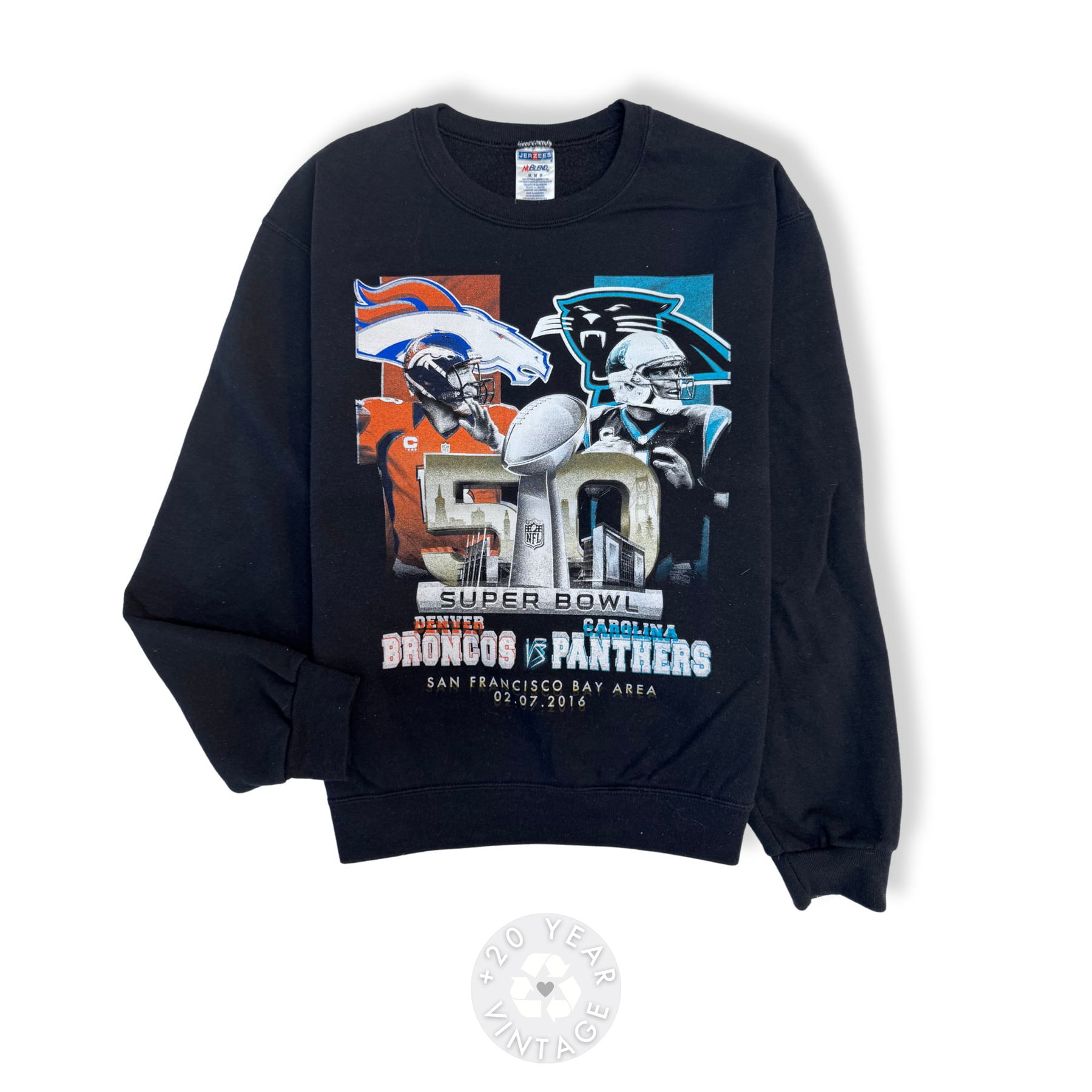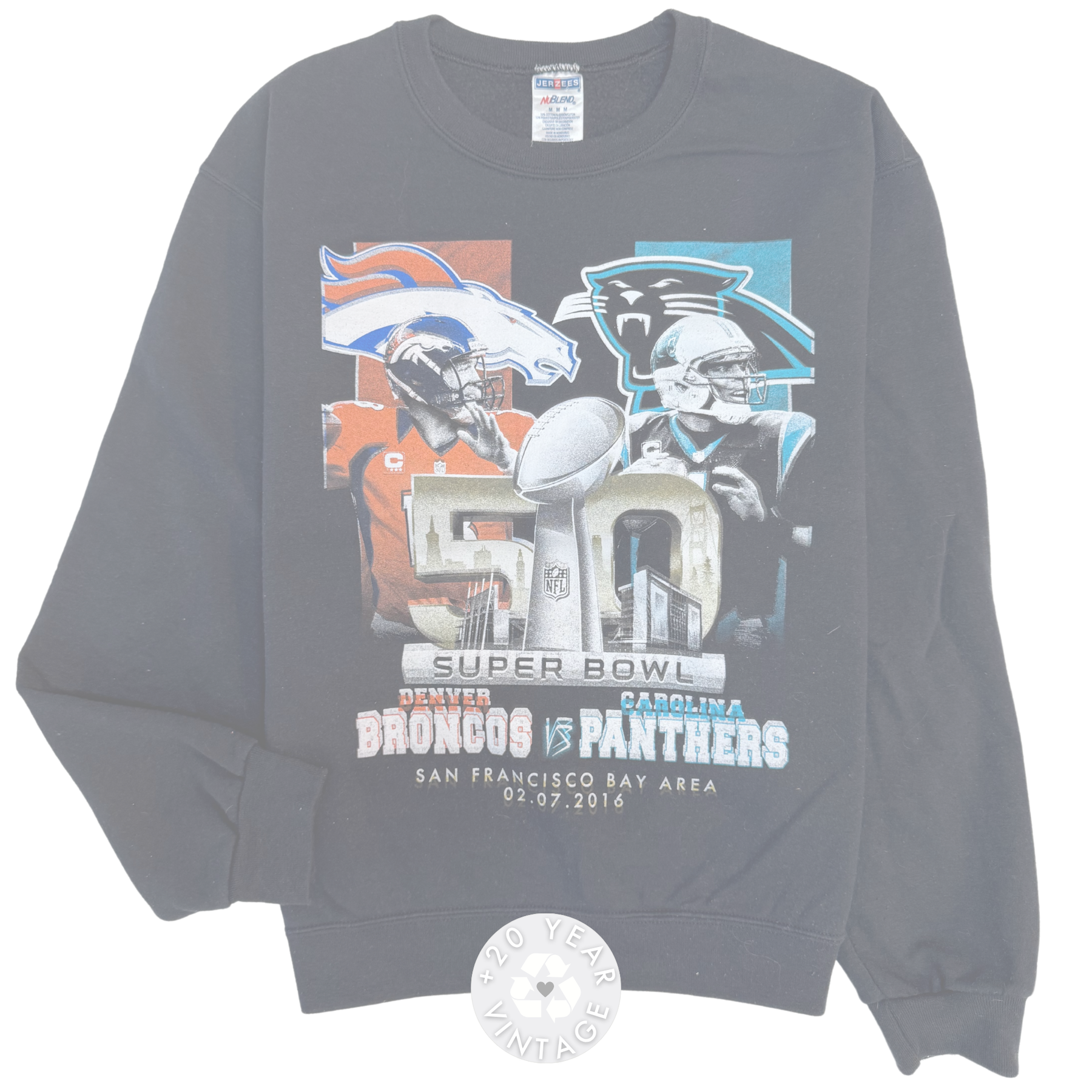 Super Bowl 50 crewneck sweater featuring Denver Broncos vs Carolina Panthers graphic on front.Would fit well up to MTag size is M- Long SleeveCrew necklineCotton blend materialFront graphic