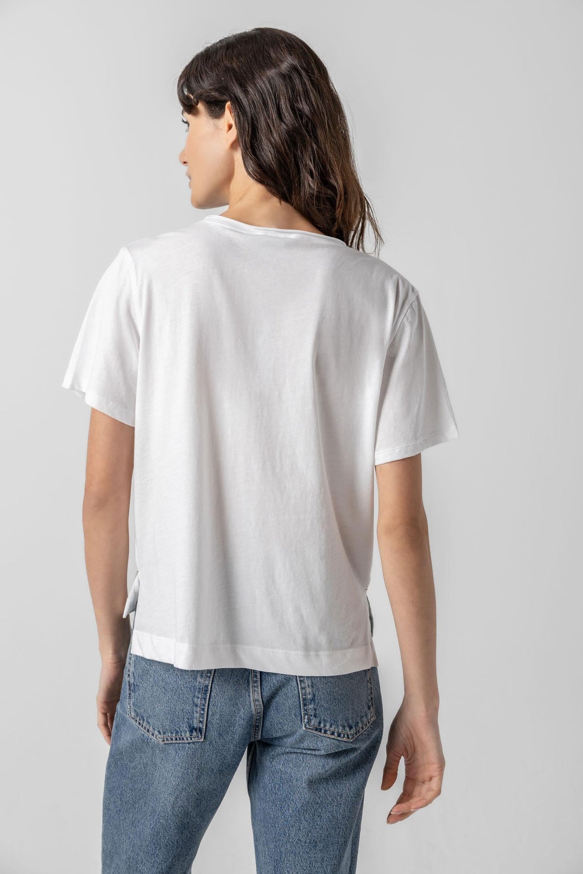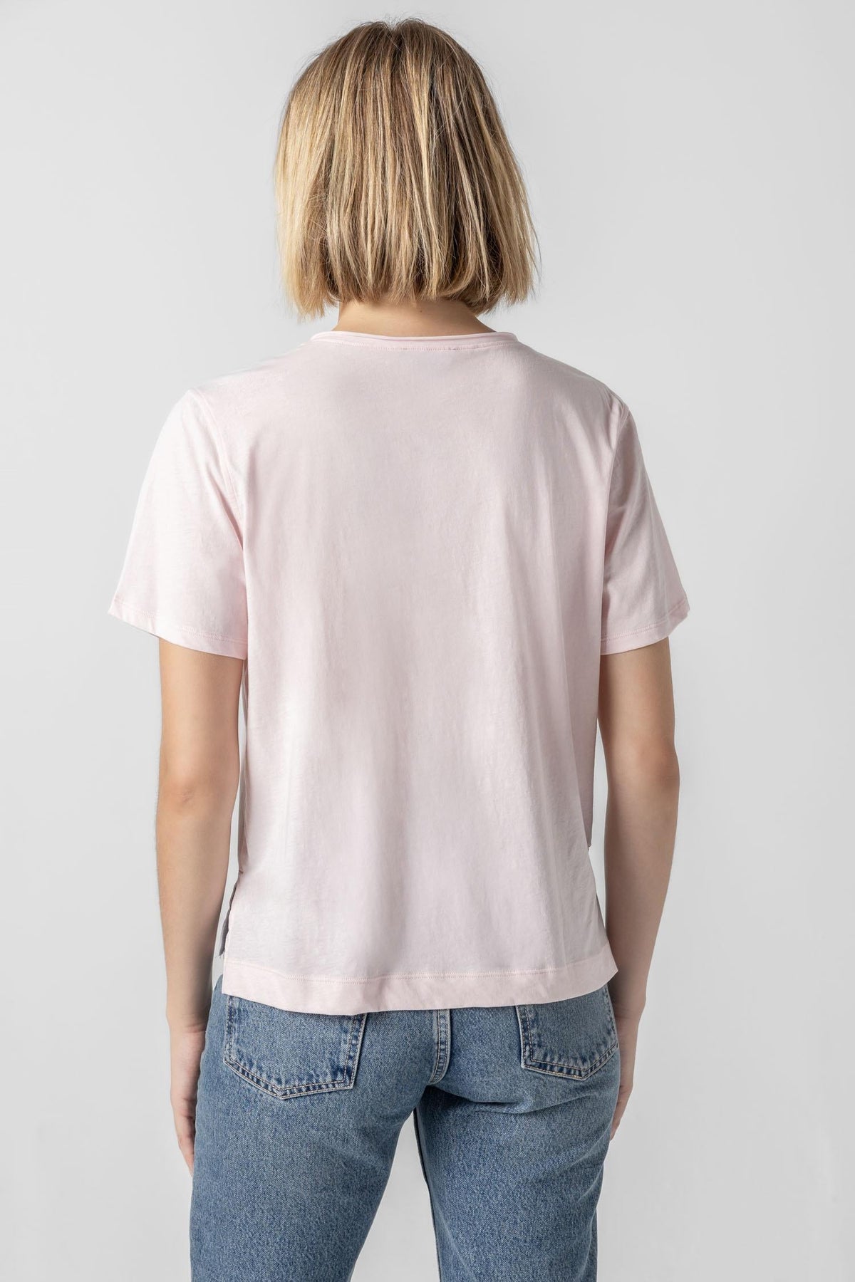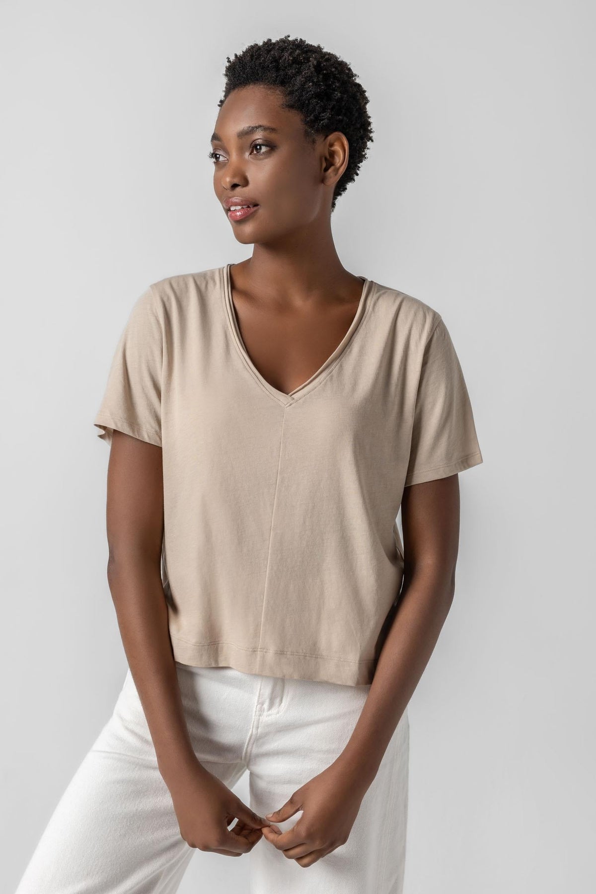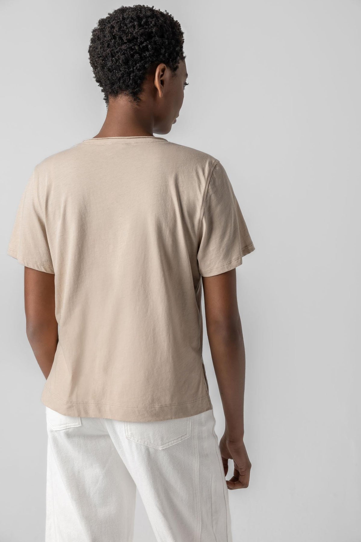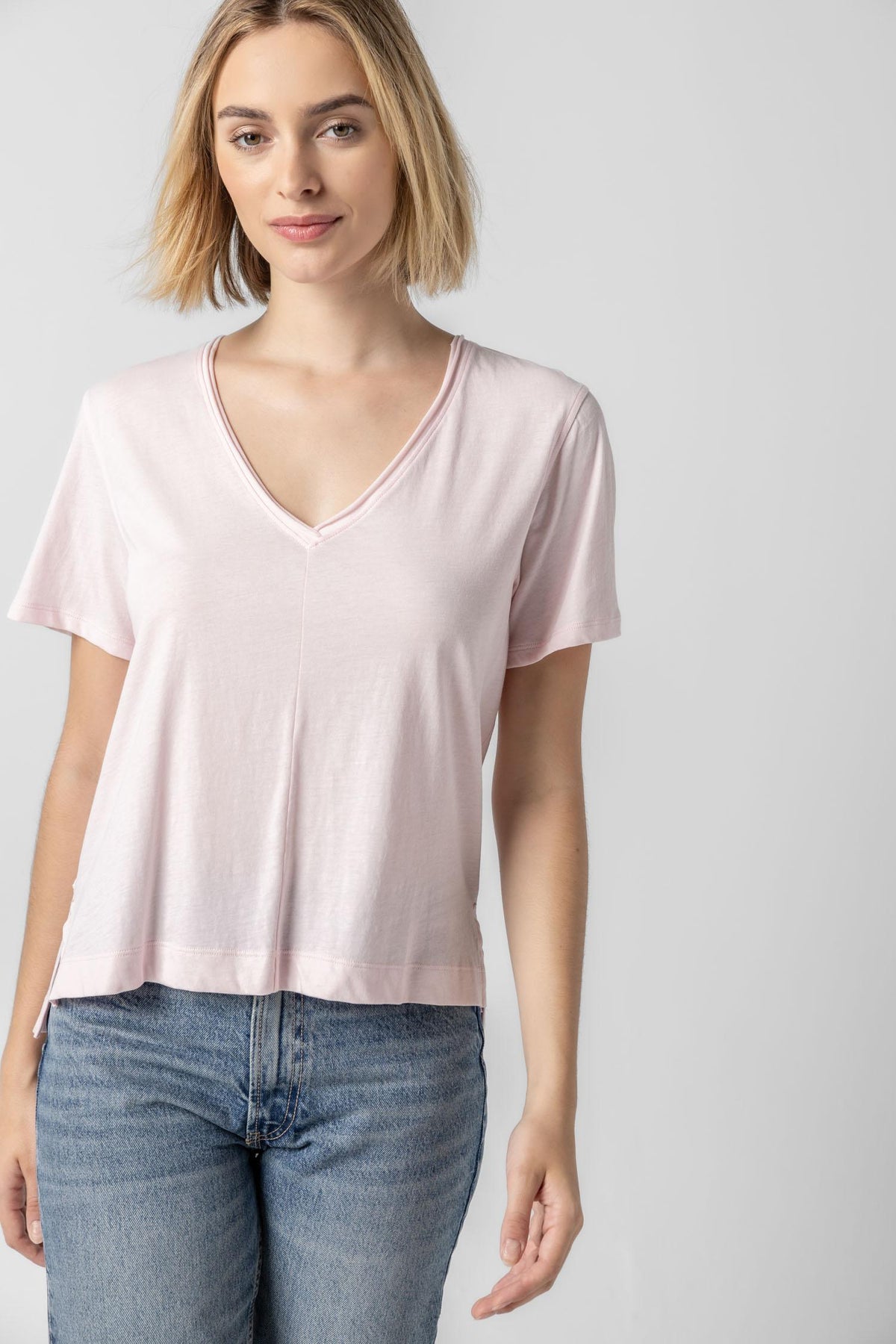Our Easy Short Sleeve V-Neck in our Soft Wash Jersey fabric has a relaxed body and slightly longer sleeves for the perfect amount of arm coverage. With a slight high low hemline with side slits and raw edge trim around the neckline, this simple shape is full of subtle details.